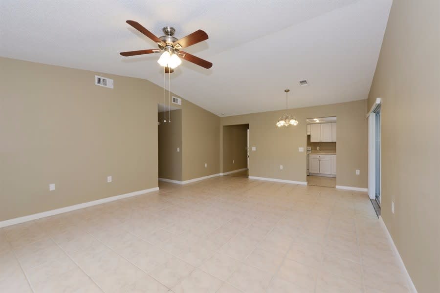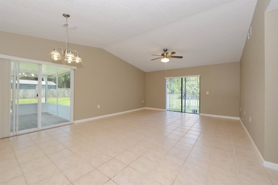 You will love making this gorgeous house your new home! The front exterior boasts a two-car garage, a covered entrance, and a shaded, spacious lawn that wraps around to the backyard, where you will find lots of outdoor space, both an exposed and screened-in patio, and a fence wrapping itself around everything for your convenience. The interior features stylish tile flooring and plush carpeting throughout the open layout, lots of natural lighting, vaulted ceilings, and a kitchen equipped with all-white cabinetry, recessed lighting, and coordinating appliances. Make this your home and apply today!